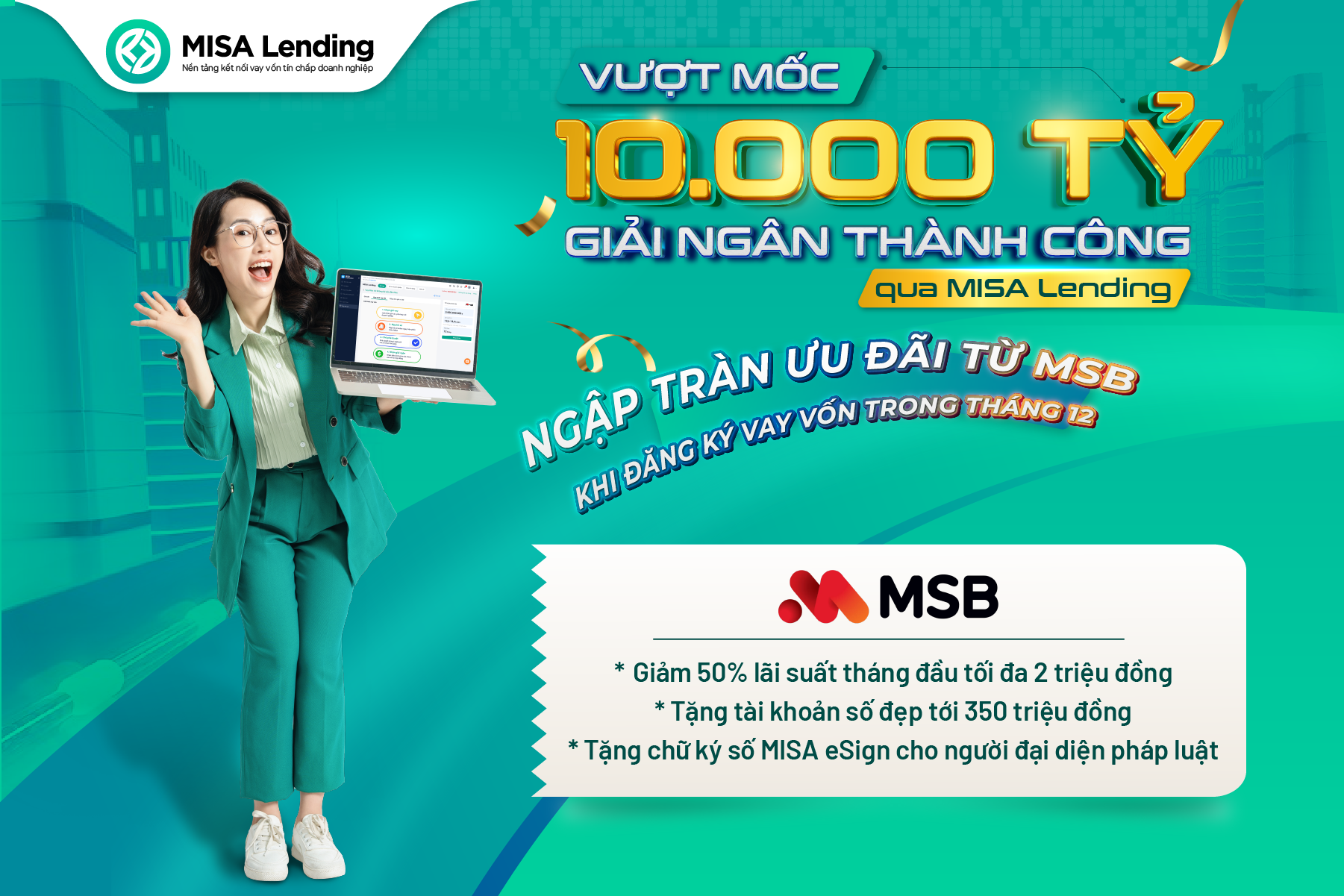 Đồng hành cùng doanh nghiệp, MSB và MISA thường xuyên đem đến nhiều chương trình ưu đãi hấp dẫn dành tặng riêng cho khách hàng MISA. Đặc biệt trong tháng 12 -đánh dấu cột mốc “10.000 tỷ giải ngân thành công qua nền tảng MISA Lending”, MSB triển khai hàng loạt chương trình ưu đãi hấp dẫn như: Giảm lãi suất, tặng tài khoản số đẹp, tặng chữ ký số.