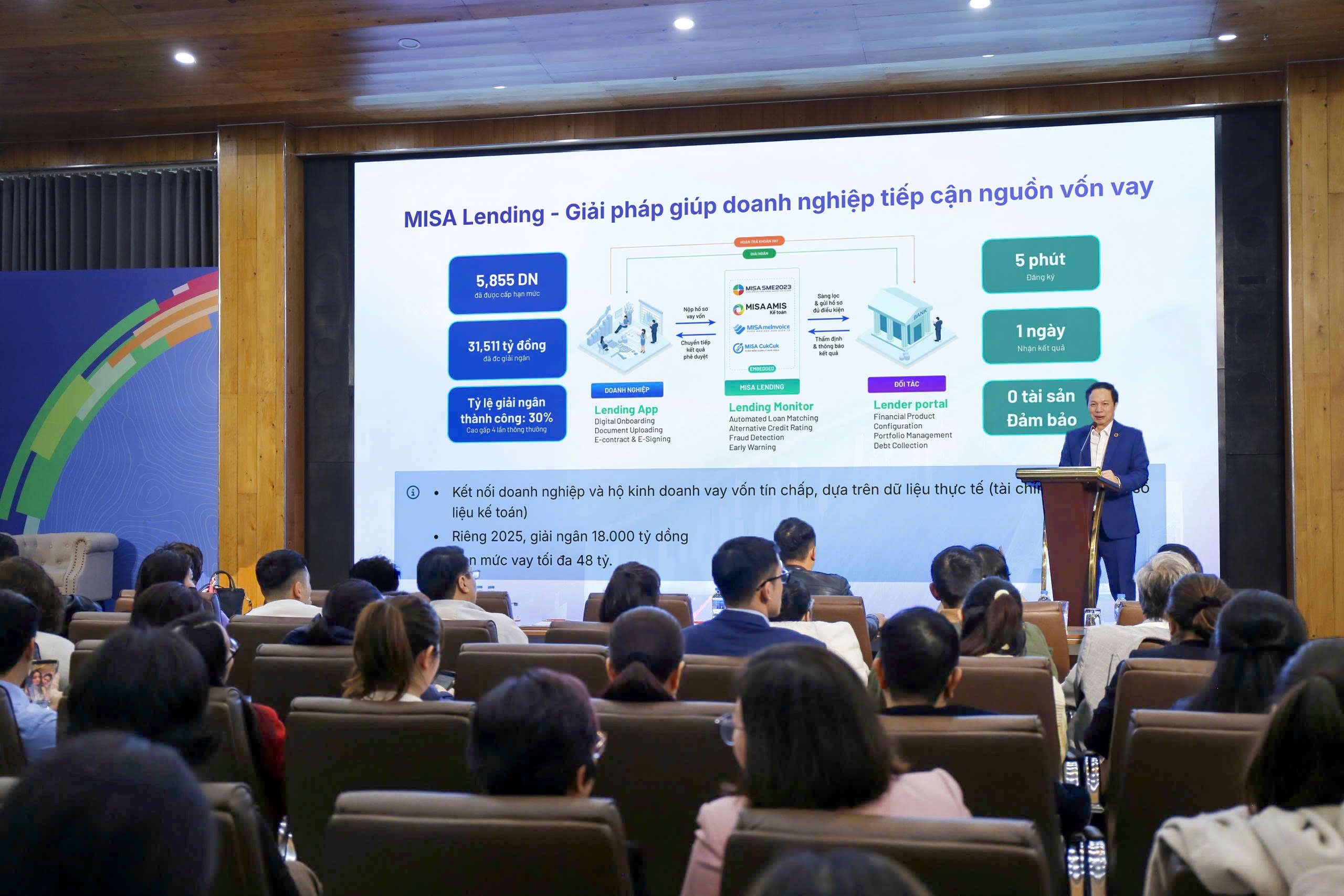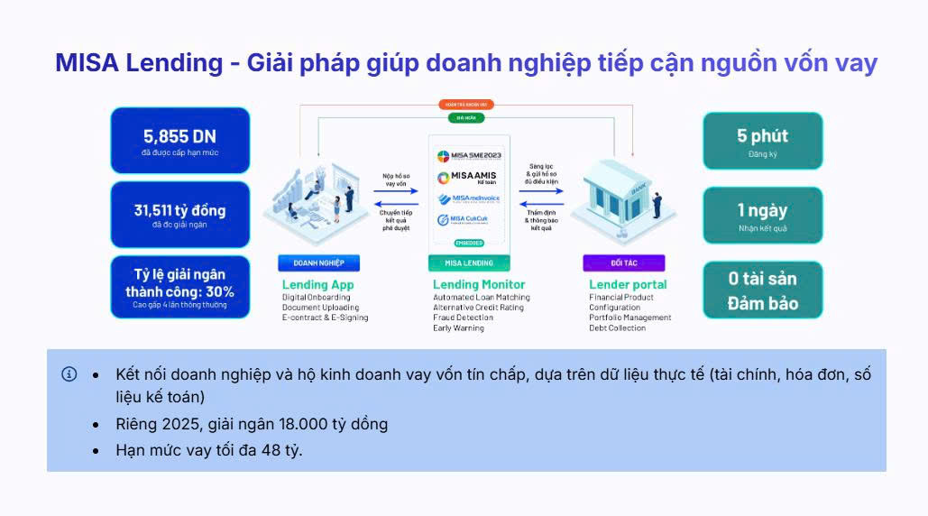 Bên cạnh JETPAY BankHub, Nền tảng kết nối vay vốn MISA Lending đã trở thành tâm điểm chú ý khi giải quyết trực tiếp bài toán vốn cho doanh nghiệp. Hoạt động như một cầu nối trung gian, MISA Lending giúp các tổ chức và cá nhân có nhu cầu vay vốn tiếp cận nhanh chóng với mạng lưới ngân hàng uy tín hàng đầu Việt Nam.