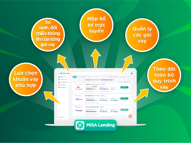 MISA Lending ra đời đã trở thành cầu nối, mở ra cơ hội giúp khách hàng tiếp cận với nhiều gói vay từ các tổ chức tín dụng uy tín lớn trên cả nước. Nền tảng kết nối vay vốn tín chấp của MISA giúp doanh nghiệp giảm bớt thời gian chuẩn bị hồ sơ vay vốn, tiết kiệm tối đa chi phí đi lại và đặc biệt rút ngắn thời gian chờ phê duyệt.