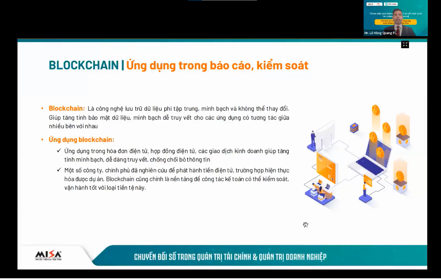 Ông Lê Hồng Quang – Phó Tổng Giám Đốc Công ty CP MISA đã chia sẻ về xu hướng công nghệ trong lĩnh vực tài chính cũng như những tác động của công nghệ tới ngành tài chính của Việt Nam. Đặc biệt, cách áp dụng AI vào quản trị tài chính của doanh nghiệp mà diễn giả Lê Hồng Quang chia sẻ tại webinar đã nhận được những phản hồi tích cực từ Quý khán giả tham dự.