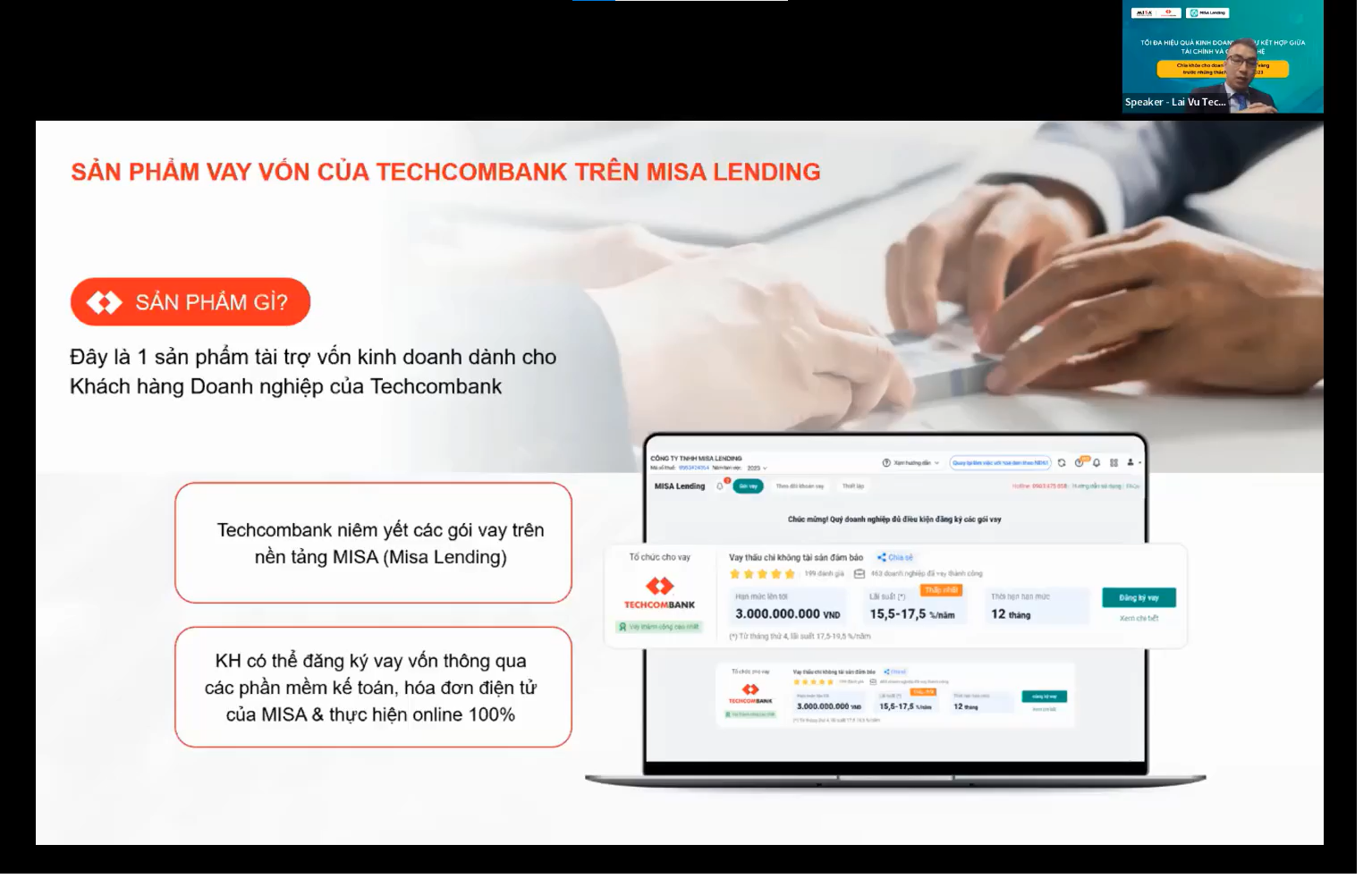 Chia sẻ trong webinar về giải pháp giúp doanh nghiệp tăng trưởng, sản phẩm Gói vay Thấu chi không tài sản đảm bảo của Ngân hàng Techcombank trên nền tảng MISA Lending là một trong những giải pháp tối ưu giúp doanh nghiệp phục hồi.