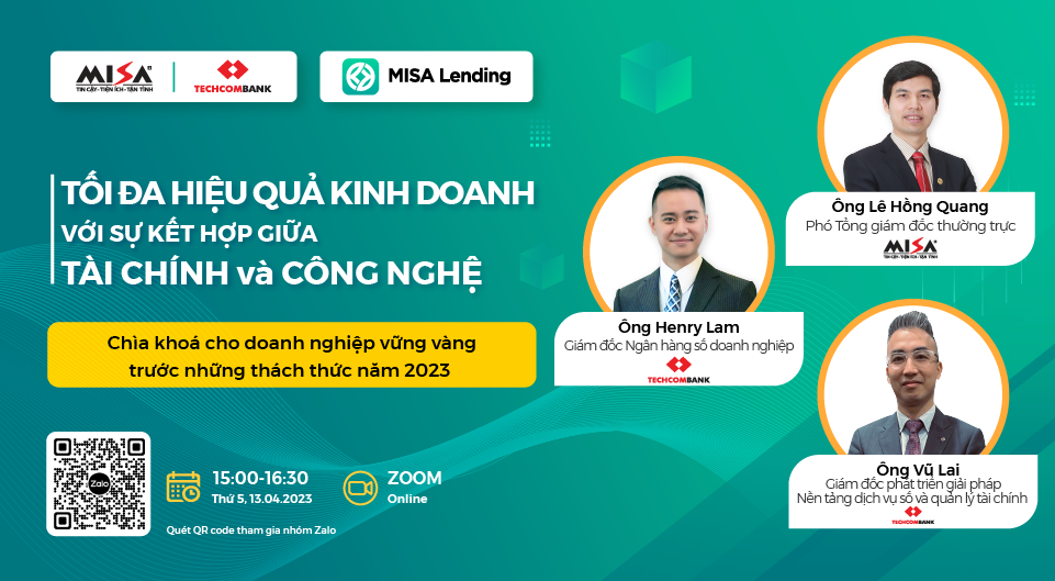 Ngày 13/04/2023 vừa qua, MISA và ngân hàng Techcombank đã phối hợp và tổ chức thành công Webinar “Tối ưu hiệu quả kinh doanh với sự kết hợp giữa Tài chính và Công nghệ” với sự tham gia của hơn 200 Chủ doanh nghiệp/CEO trên cả nước.