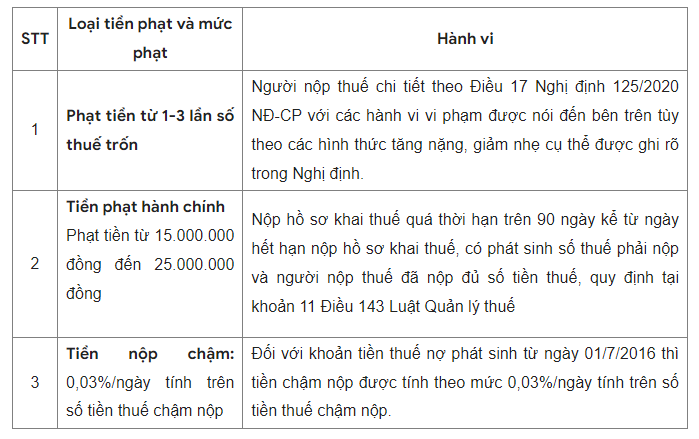 Căn cứ Nghị định 125/2020/NĐ-CP quy định xử phạt hành chính về thuế và hóa đơn (nêu cụ thể là Mục I, Chương II; bảng phía dưới hiện tóm tắt mức phạt đối với 1 số hành vi vi phạm chính: