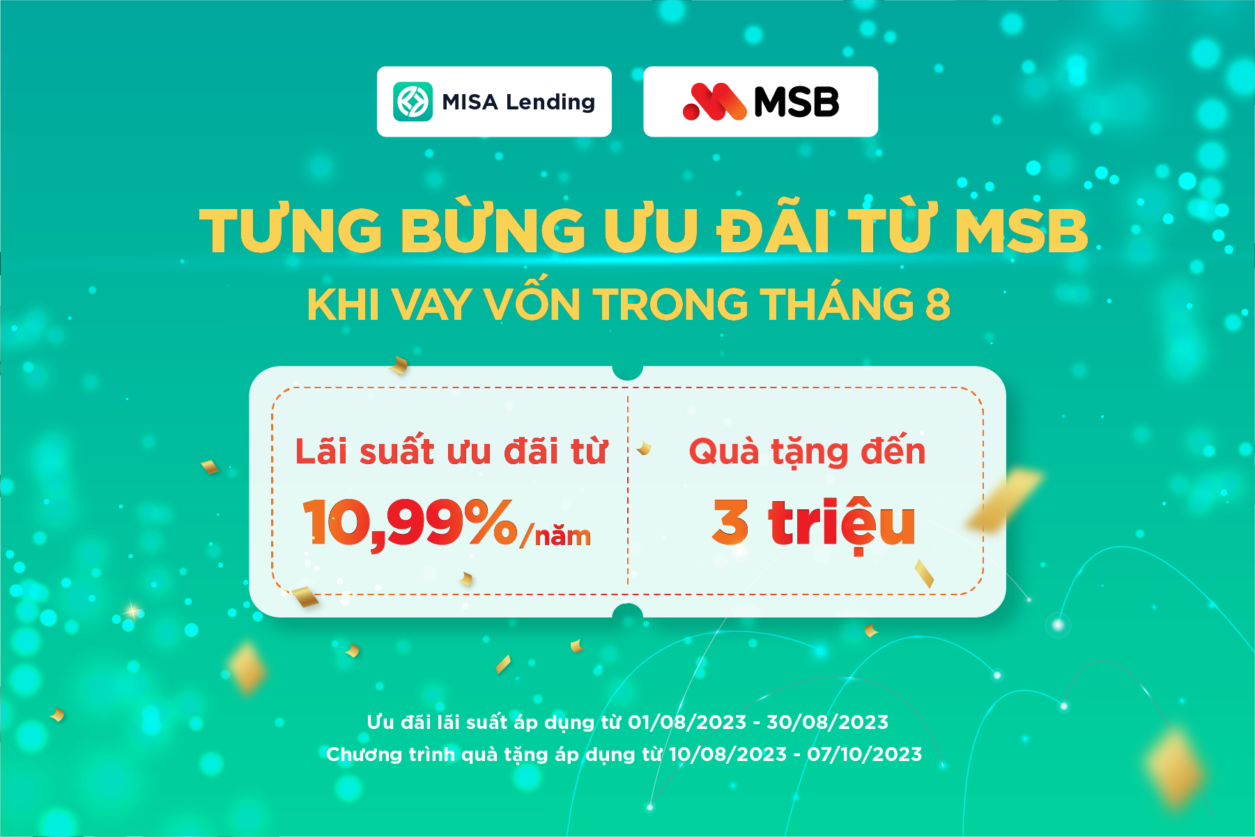 Trong tháng 8, để chào mừng cột mốc 2.000 tỷ giải ngân qua nền tảng MISA Lending, MSB đem đến nhiều chương trình ưu đãi và quà tặng hấp dẫn dành riêng cho khách hàng MISA.
